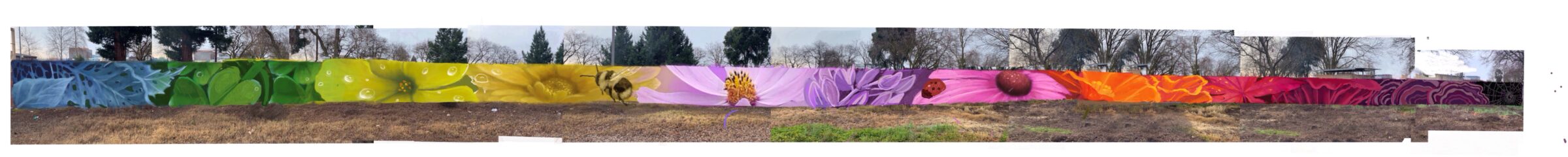 The mural is titled “Rivers in Bloom” and showcases native flora and fauna throughout the seasons. Starting at the west side of the artwork blue leaves float along the surface (winter) and then morph into green clovers and yellow flowers (spring), pink and magenta flowers and a bumble bee (summer), and end on the east side of the wall with fall leaves and fungi in shades of orange and yellow (fall). The images are larger than life and magnified so that the details can be seen from a distance while traveling by foot or bike on the trail.