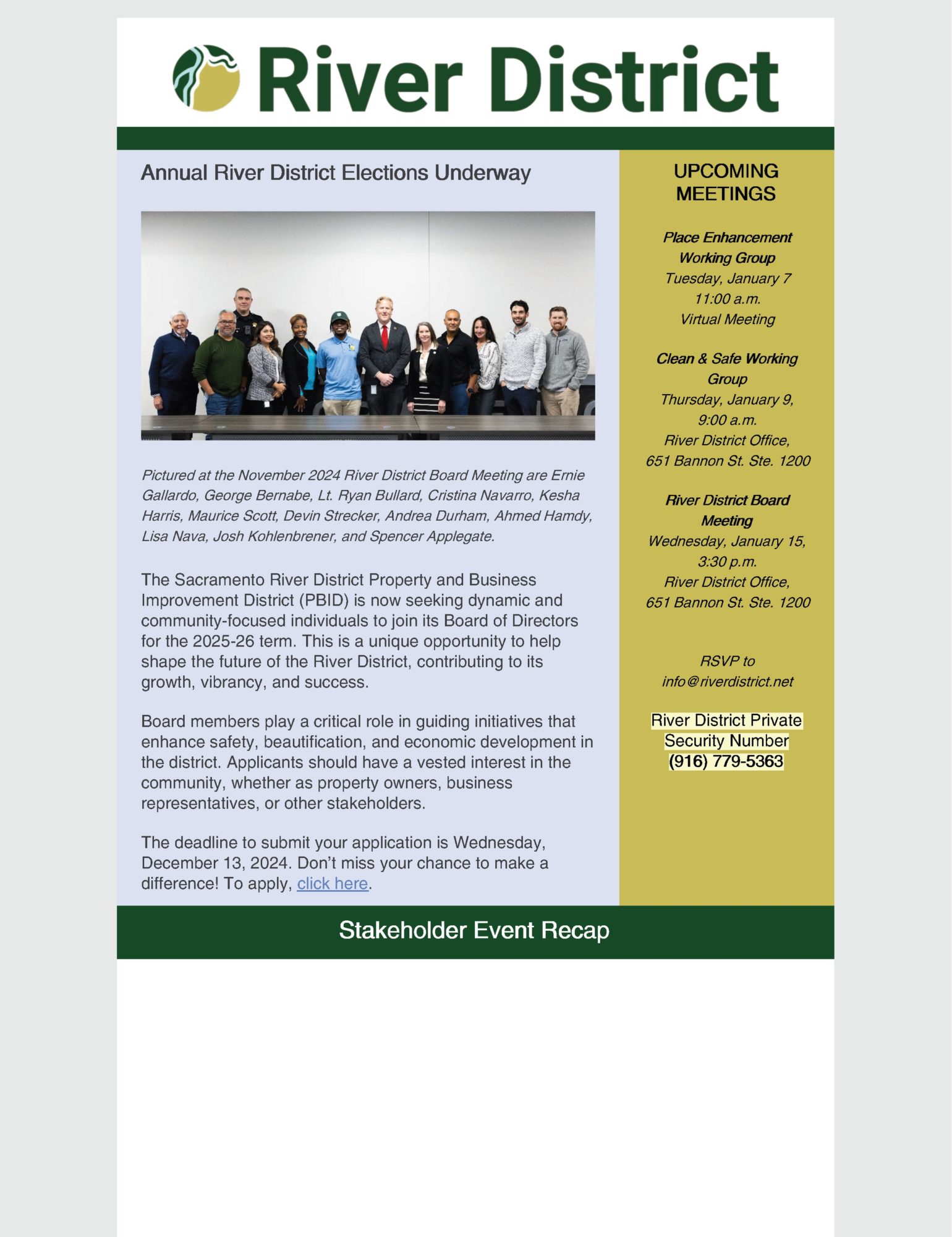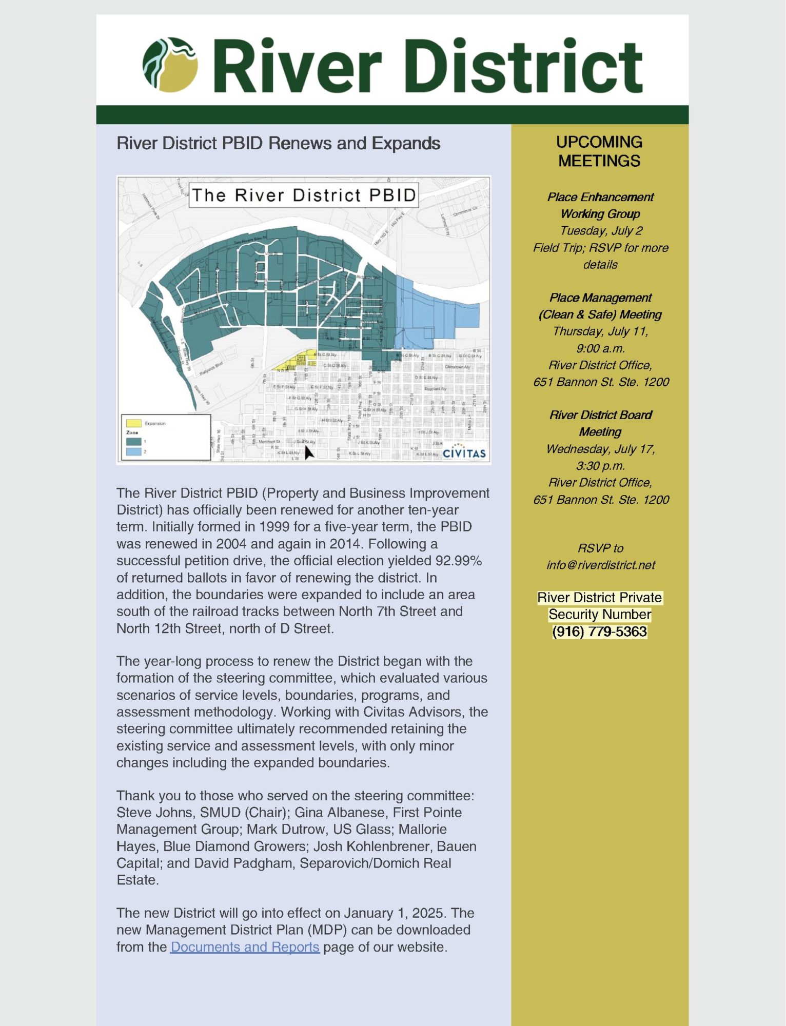 The River District’s quarterly newsletter includes updates on projects and proposals in the District, events and happenings, and accomplishments by our organization.