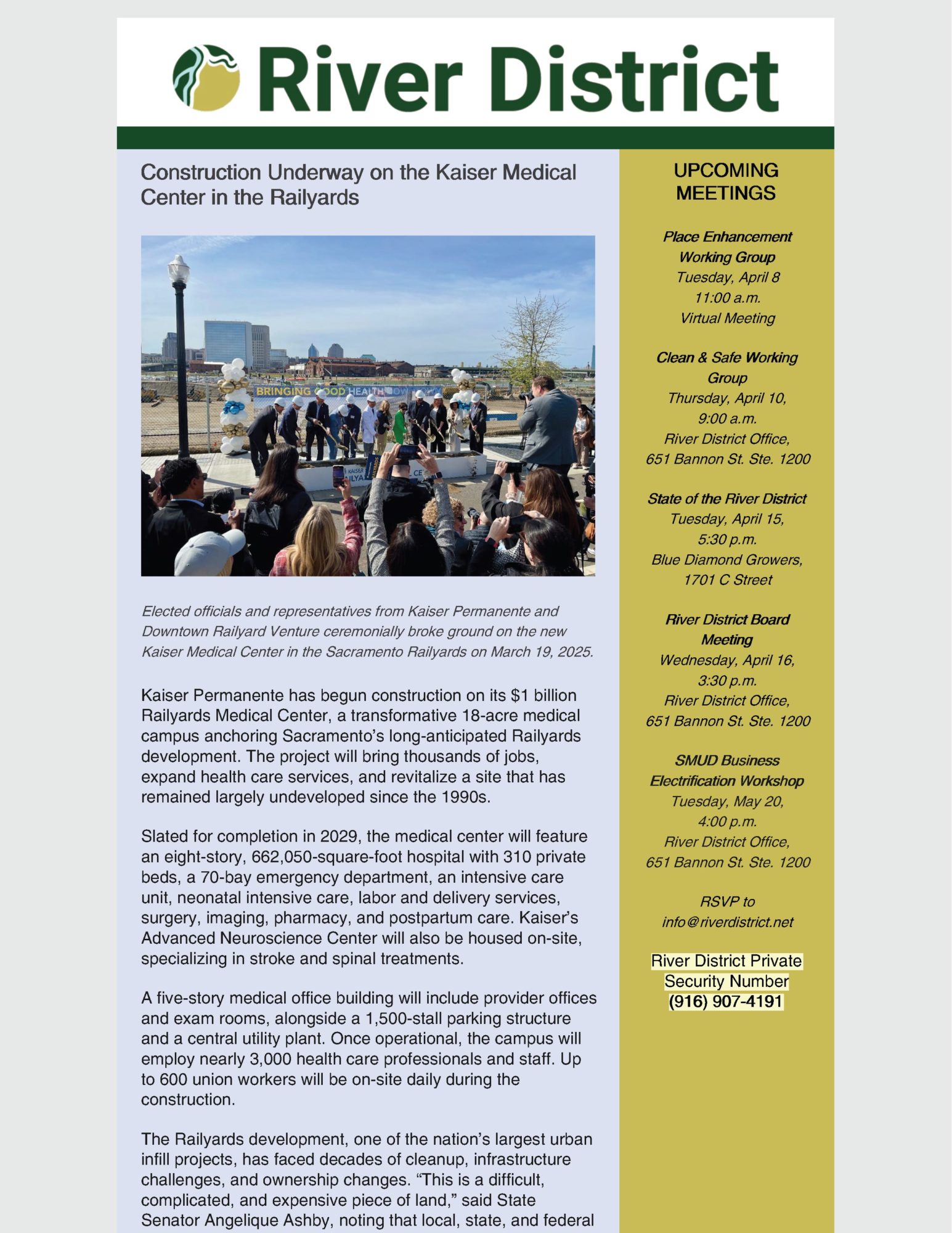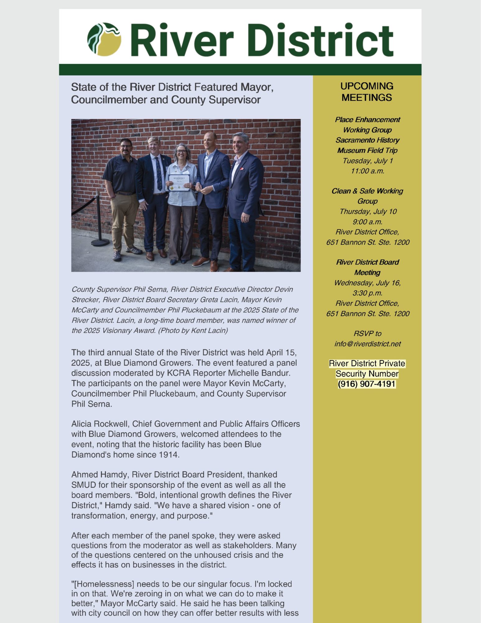 2025 Q2The third annual State of the River District was held April 15, 2025, at Blue Diamond Growers. The event featured a panel discussion moderated by KCRA Reporter Michelle Bandur. The participants on the panel were Mayor Kevin McCarty, Councilmember Phil Pluckebaum, and County Supervisor Phil Serna.