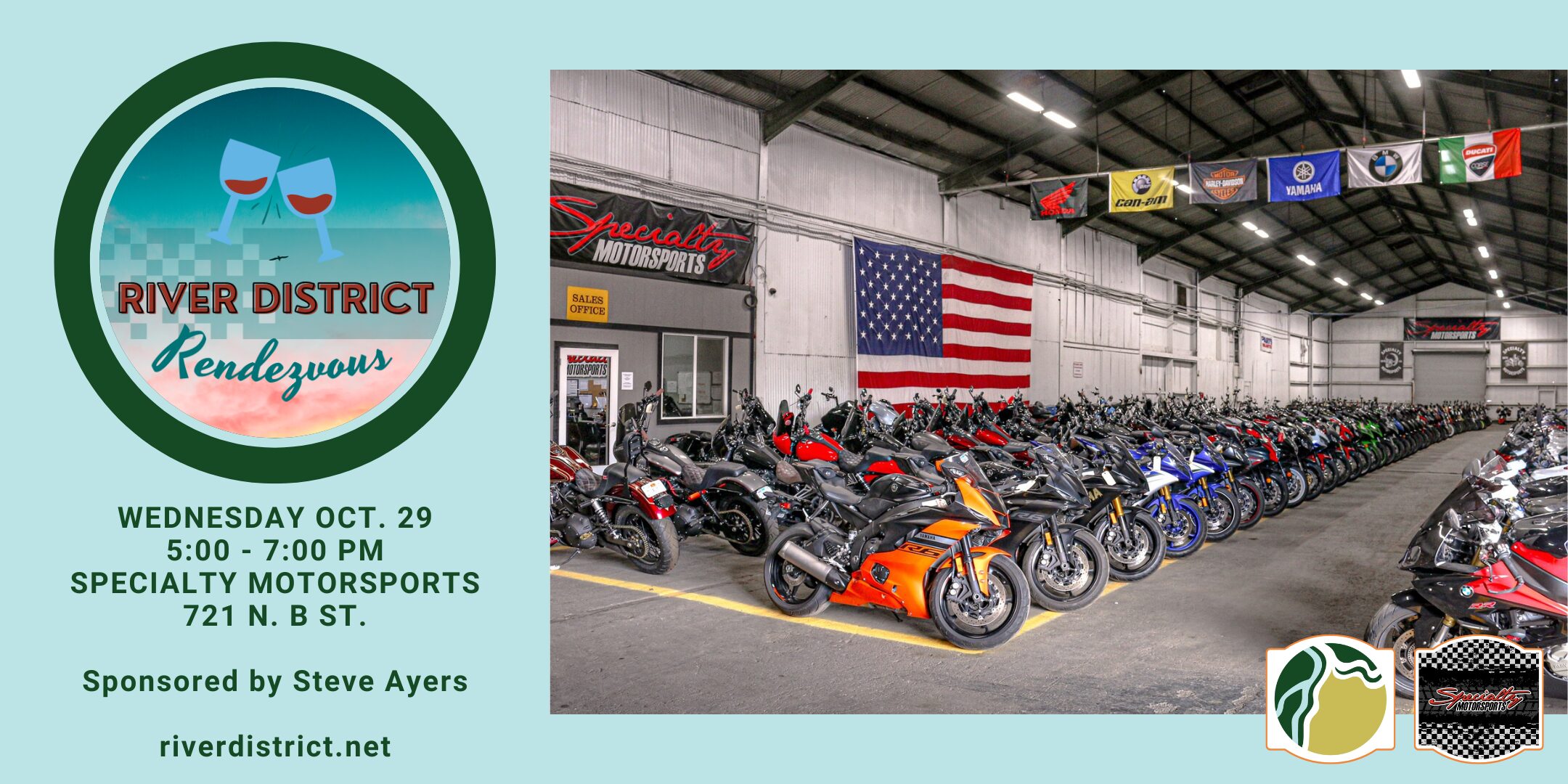 This is one Rendezvous you won't want to miss! Motor on over to Specialty Motorsports for a special happy hour networking mixer with friends of the River District on Wednesday, October 29 from 5-7pm. Food and drink sponsored by Steve Ayers. Please RSVP here or by emailing info@riverdistrict.net.