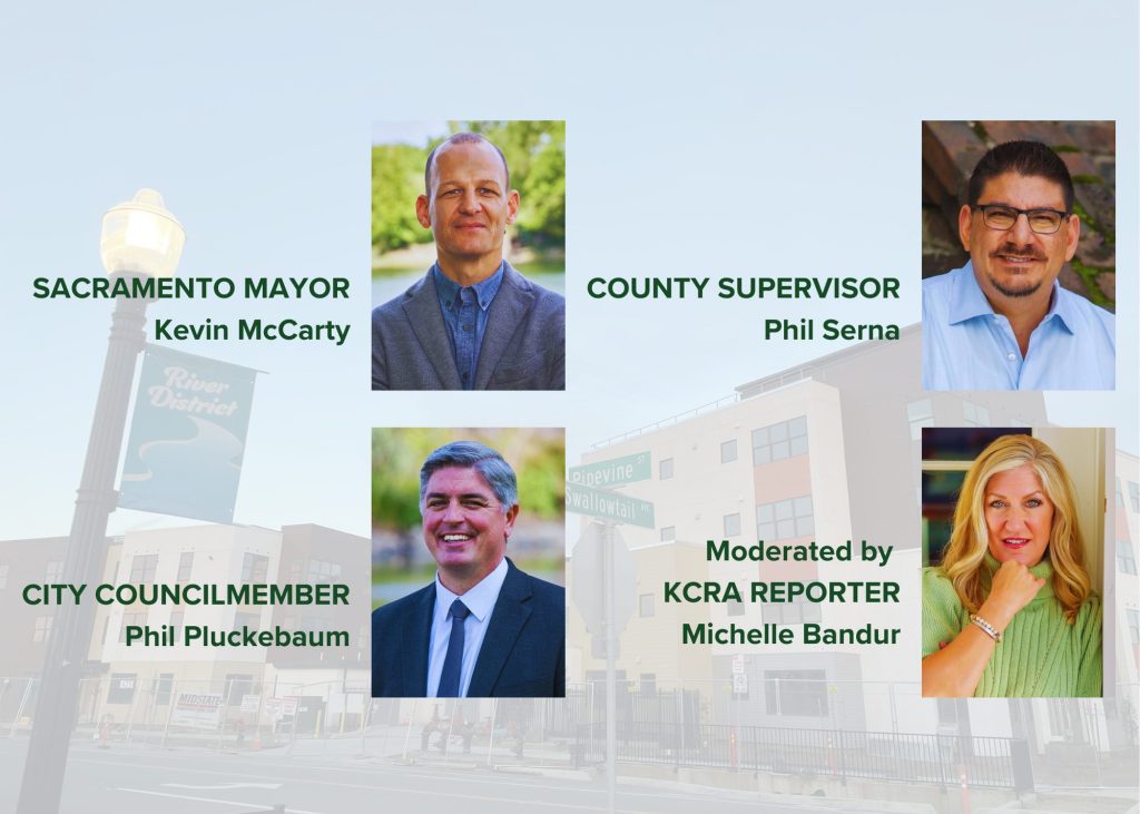 Join us for remarks and a panel discussion with Sacramento Mayor Kevin McCarty, Councilmember Phil Pluckebaum, and County Supervisor Phil Serna. Moderated by KCRA’s Michele Bandur.